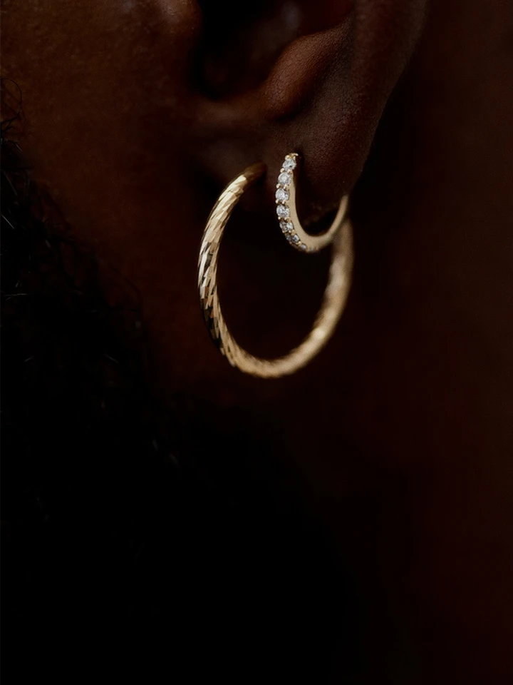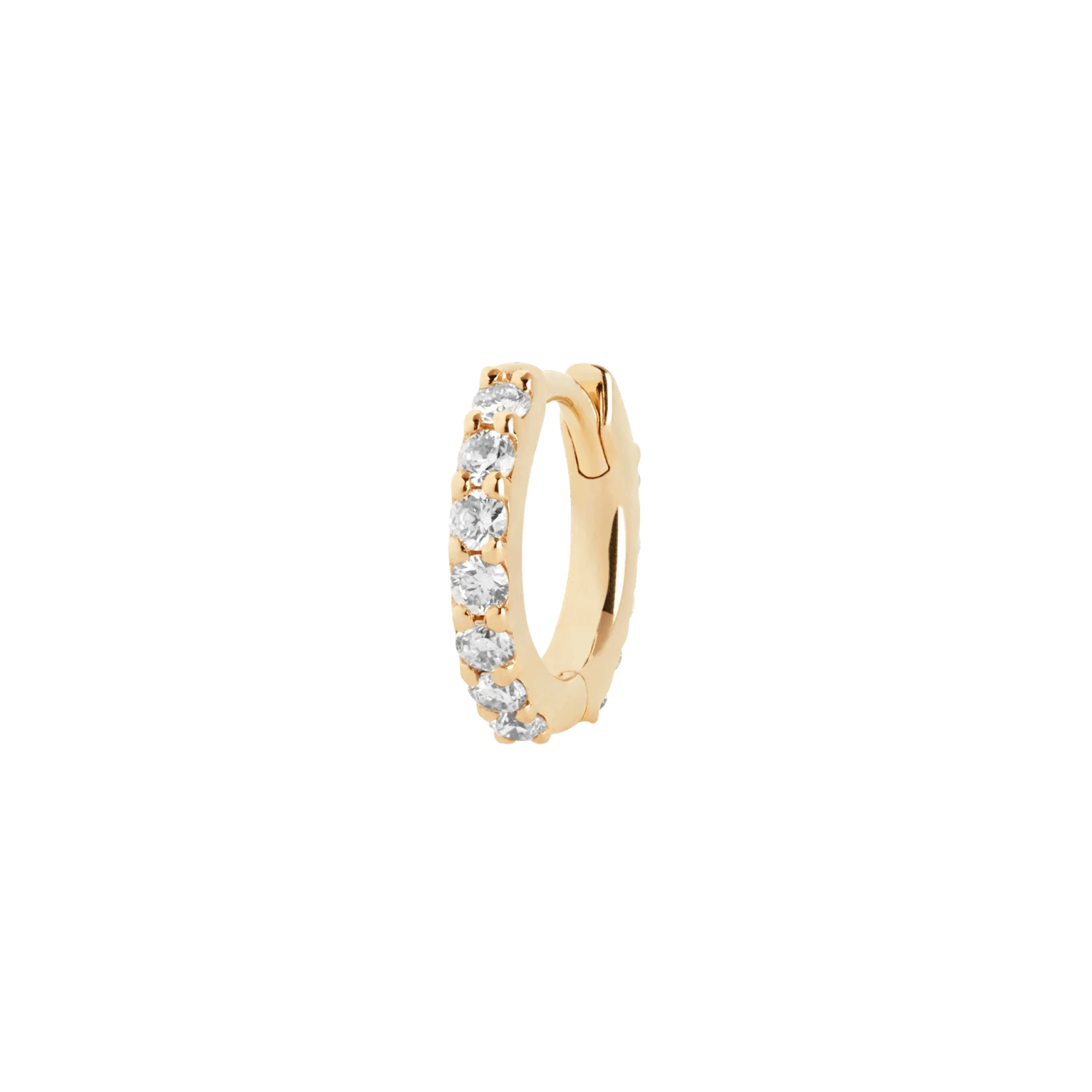 Bovary is a beautiful huggie covered in diamonds. Perfectly mixed with Rainbow huggie to create an extra dimension of shiny feels. Also available in a smaller and larger size.