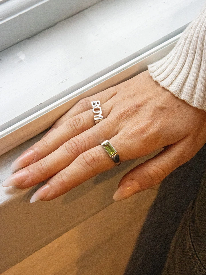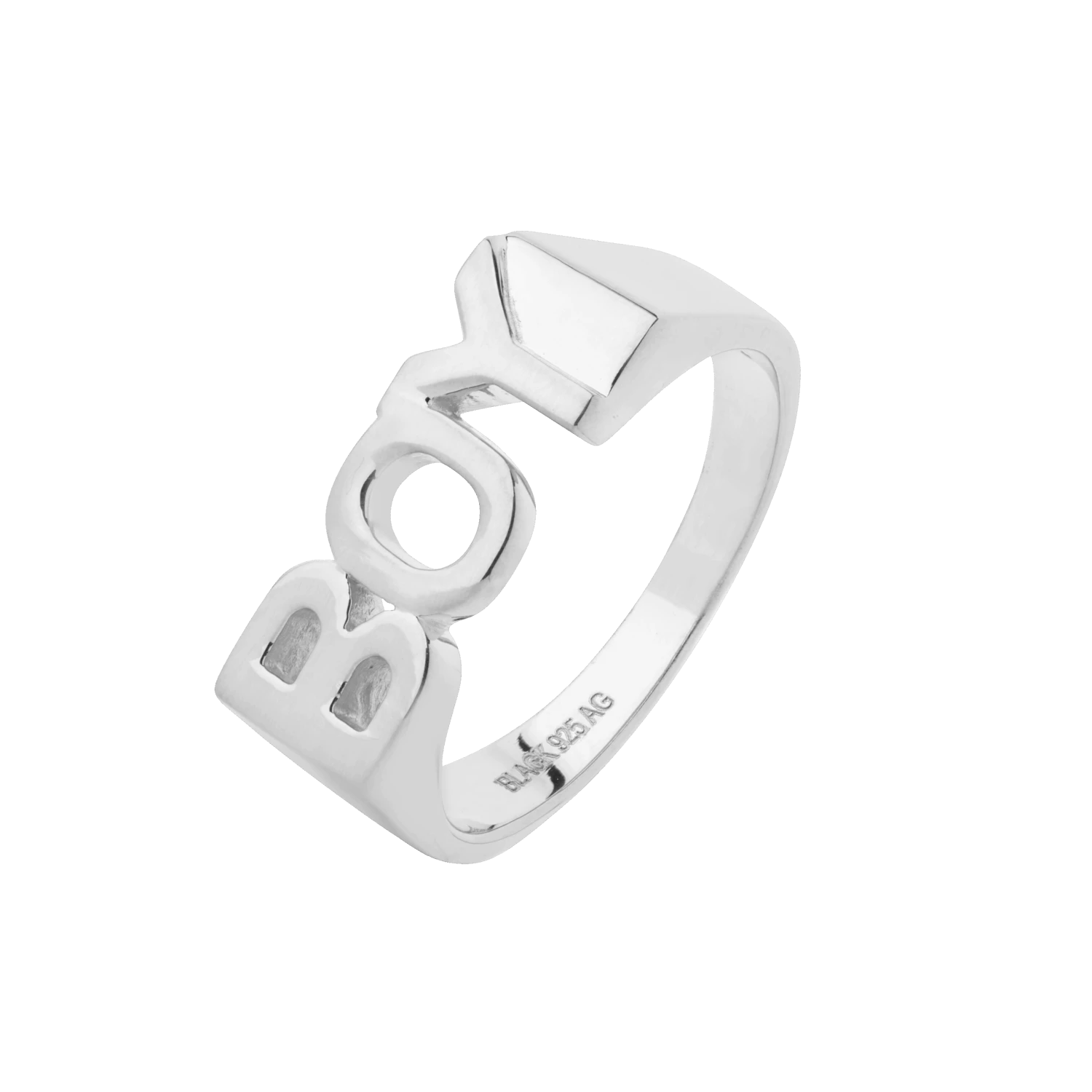 This unisex nameplate ring in silver with the words BOY is a perfect addition to your favourite stack. We call it a quirky spin on an old school favourite.