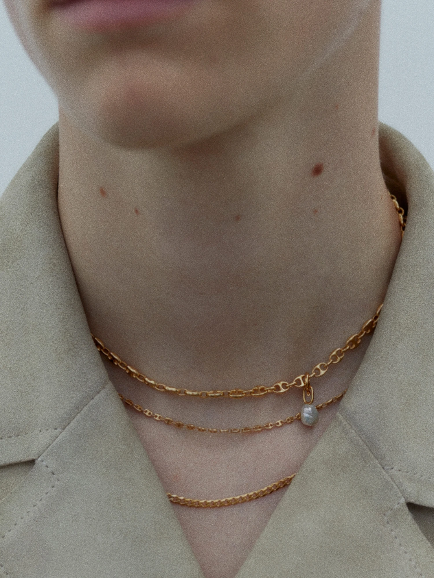 Our Cosmopolitan Necklace is a simple style, just waiting for you to create the perfect mess. May we suggest the strong statement pearls of our Martini Necklace?