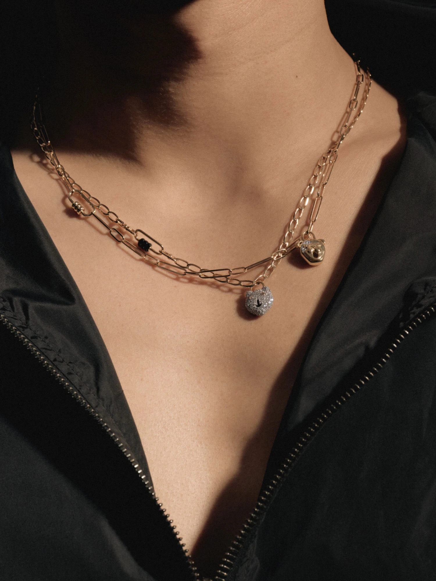 If you are up for a utility look, the Vertigo lock represents our take on the classic carabiner hook, which we have compressed down into a miniature and elegant lock. locks are an essential part of the Vertigo collection. The closing of the open chains makes it easy for you to attach locks to create a customized look.