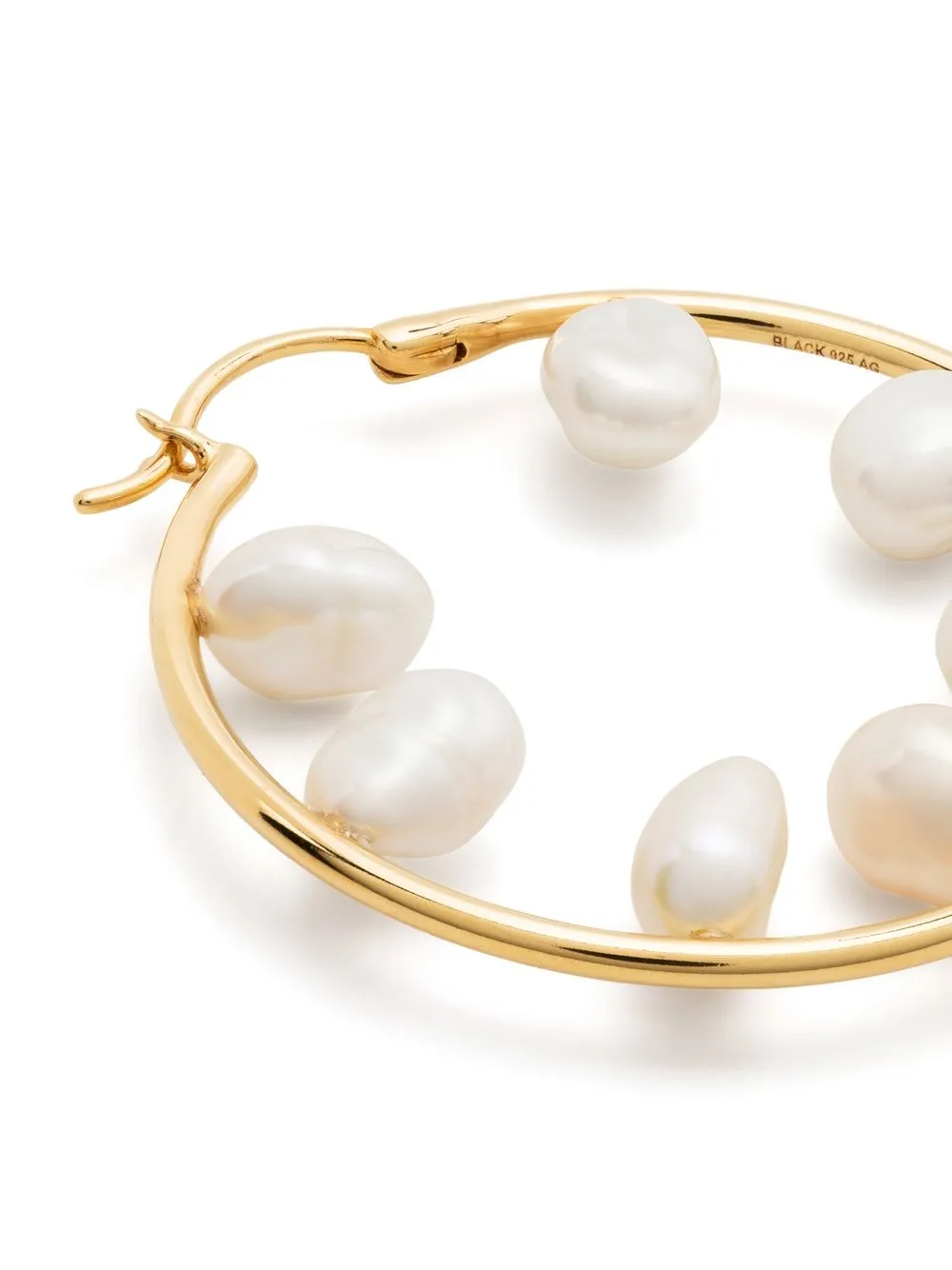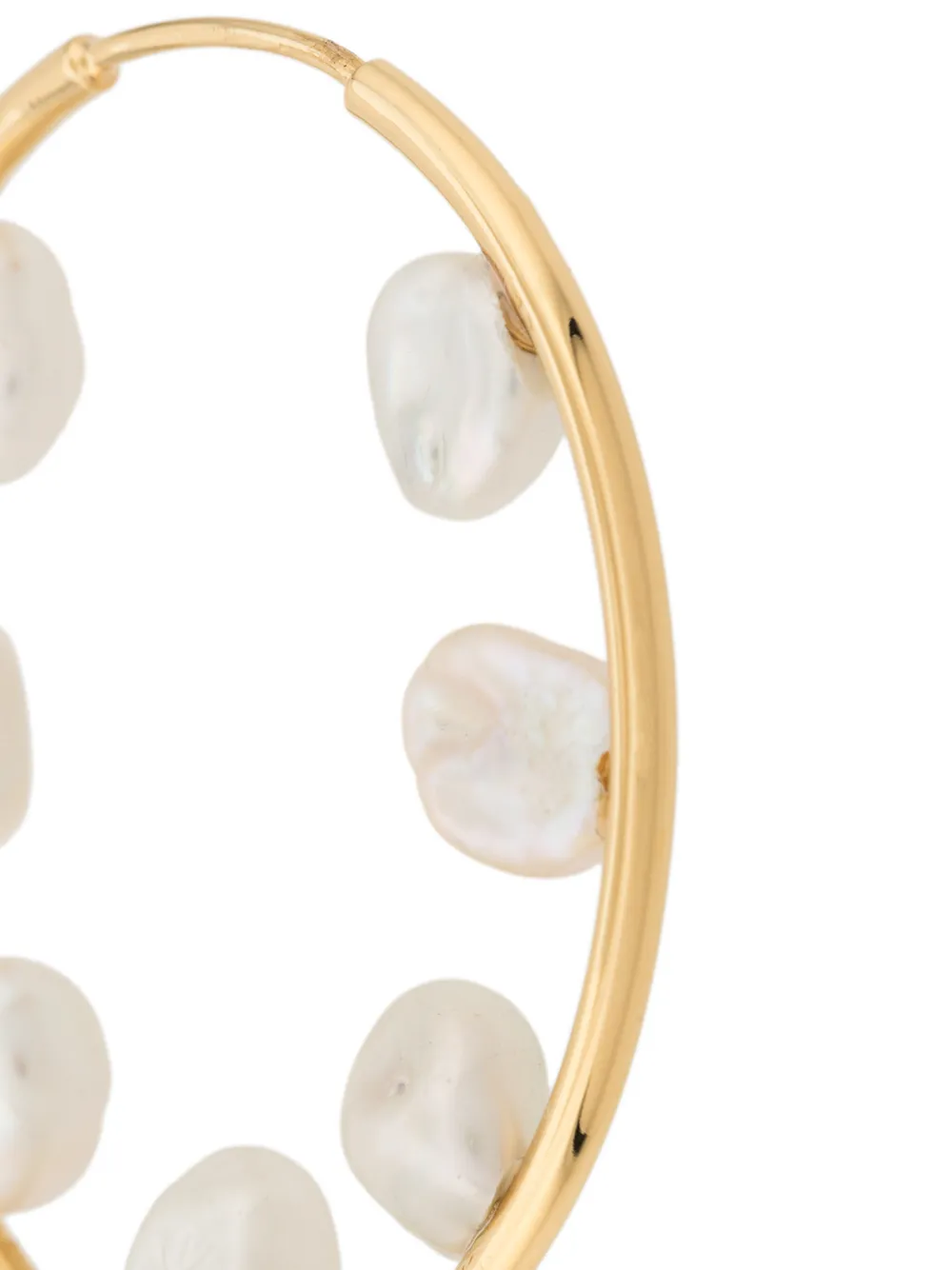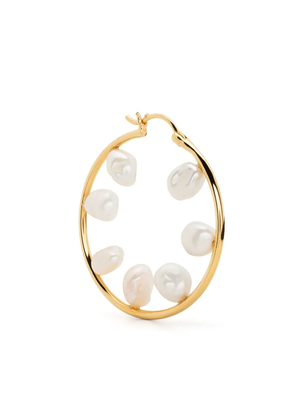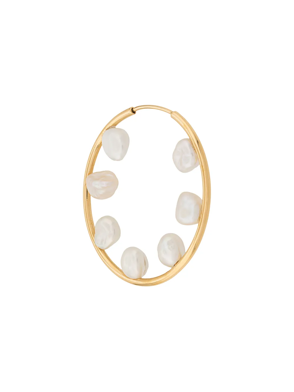 Yellow gold plated sterling silver Baroque Hoop 35 earring from Maria Black featuring a hinge closure and pearl embellishments. This is a single earring.